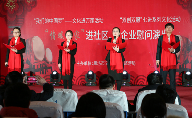 2019年2月19日上午,廊坊市伴著瑞雪迎春的兆頭和上元節張燈結彩的情景。中太大廈二樓多功能廳燈光璀璨,歡聲笑語,廊坊市文化廣電和旅游局組織的“我們的中國夢”文化進萬家系列活動在此舉辦,這也是這支文藝小分隊進企業、進社區開展“情暖萬家”慰問演出的第十場演出。市文廣旅局副局長李永生、中太投資控股集團監事會主席吉士俊出席活動并分別致辭,中太系統在廊各板塊的部分員工觀看了慰問演出。
